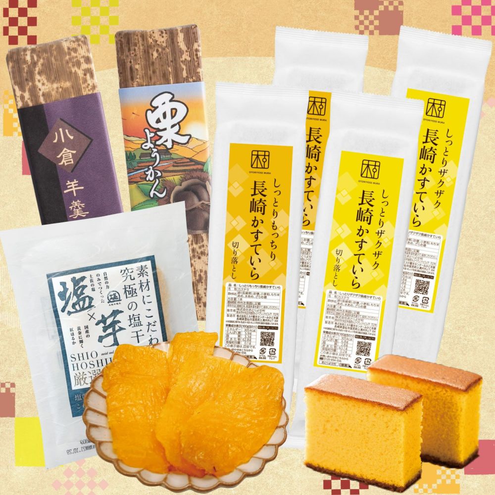 内容量しっとりもっちり長崎かすていら×2、しっとりザクザク長崎かすていら×2、国産原料プレミアム長崎かすていら×1、塩干しいも 紅はるか×1、高級竹皮巻小城羊羹(小倉)×1、高級竹皮巻小城羊羹(栗)×1