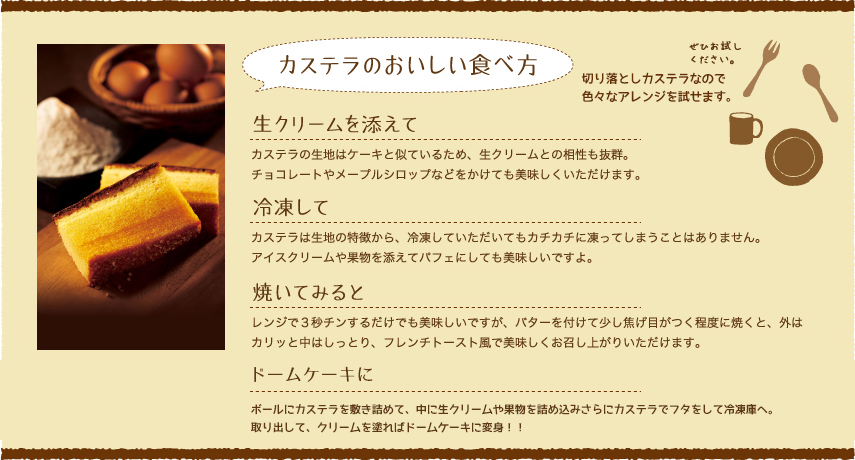 プレーンのカステラで3種類、他にも抹茶・苺・黒糖のカステラをご用意しております。カステラを定期的にお届けする定期便もご準備しております。
